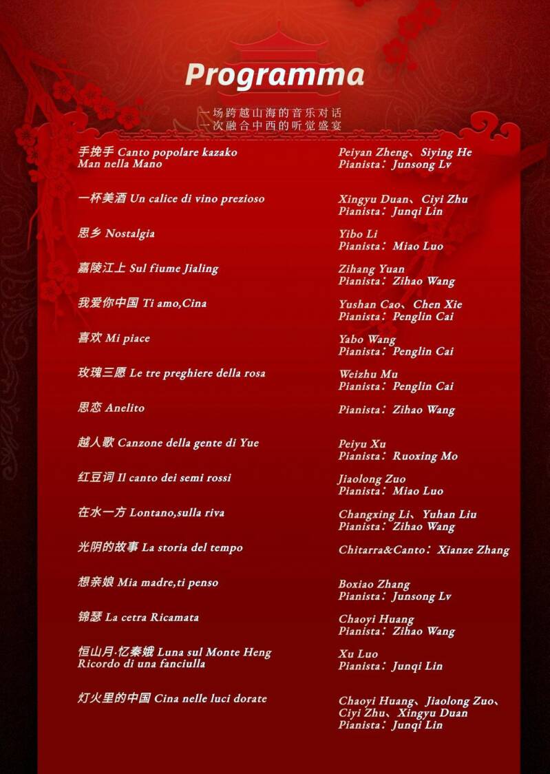 17:00 – 19:00: Il clou della serata: il grande Concerto con le esibizioni di canzoni d’arte cinese.